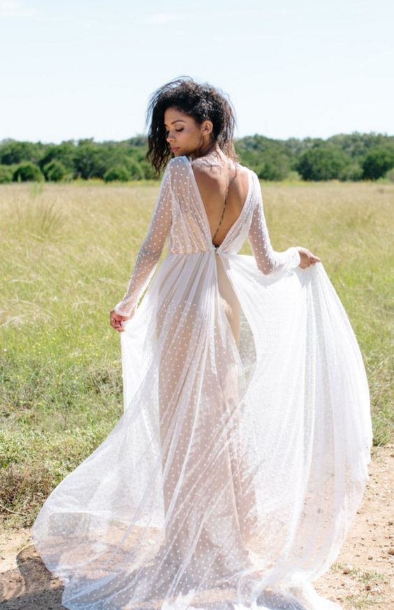 Saint Isabel on Etsy has created a delicate, timeless bridal collection combining vintage, modern and bohemian influences. Add braided or tousled hair, untamed flowers and natural makeup for a beautiful, authentic look on your wedding day. And did I mention the lacey, romantic backs of these gowns? Just stunning.